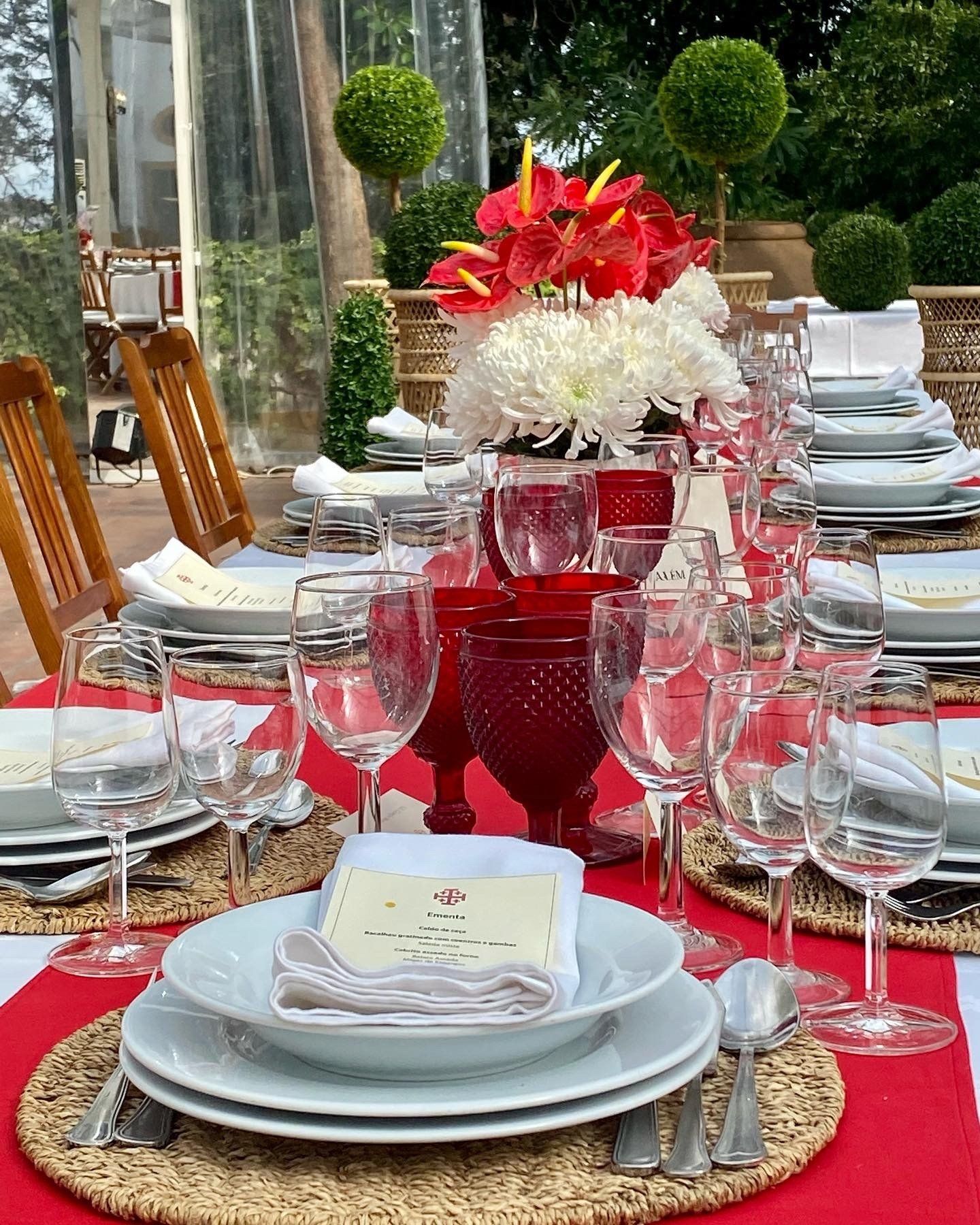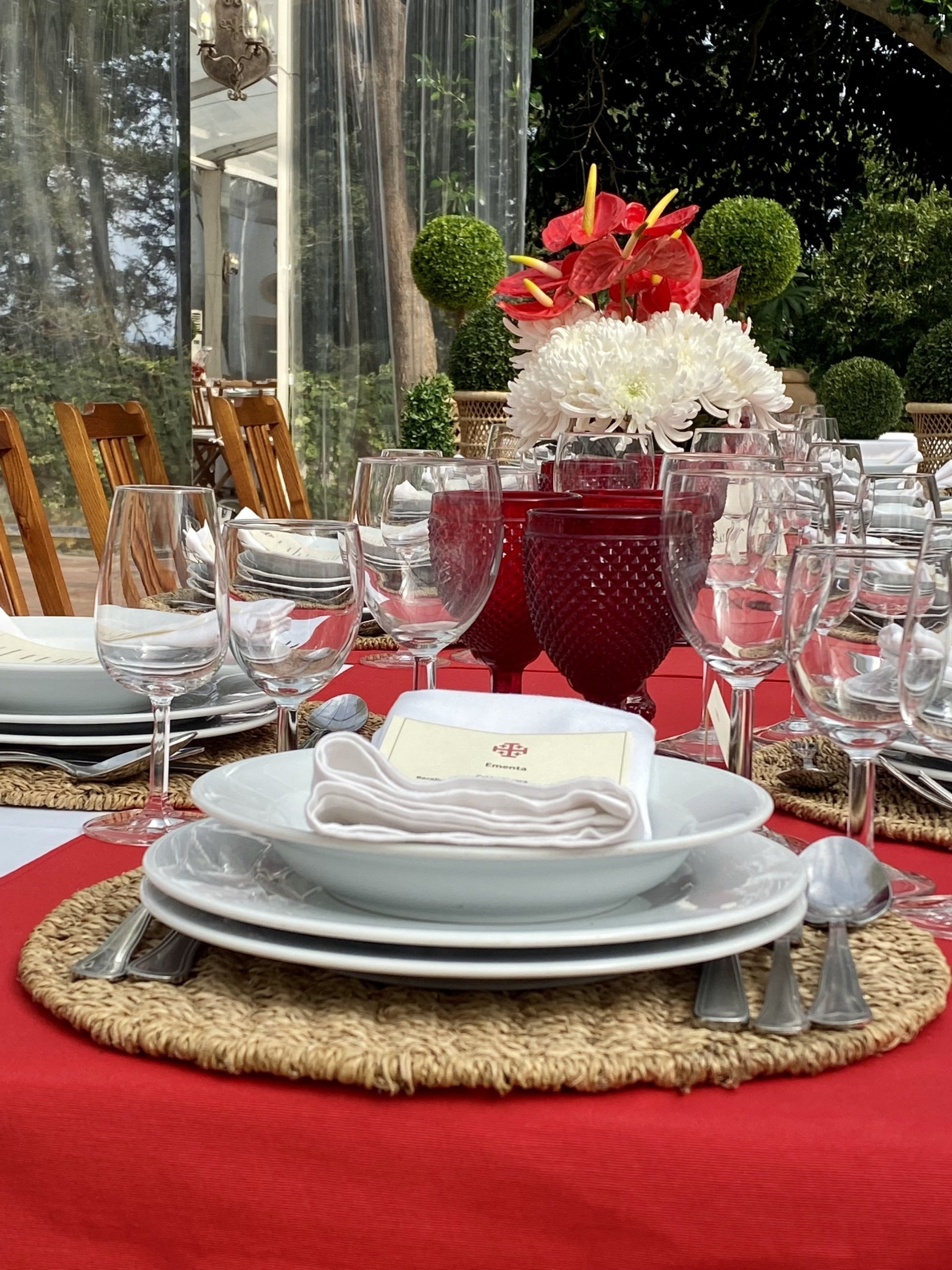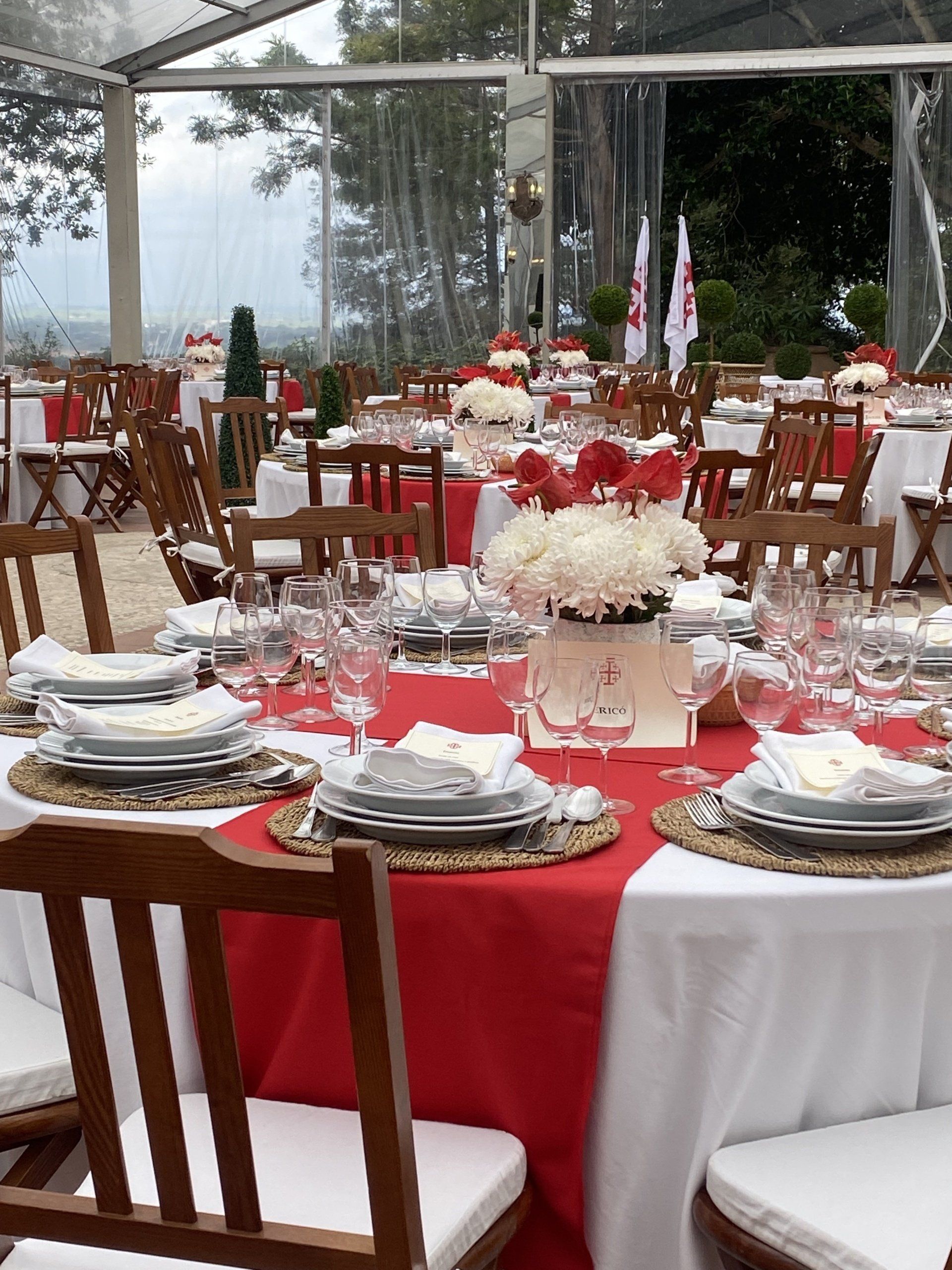 Institutional get together on a palace garden patio bright atmosphere. Colorful set up matching the host's crest